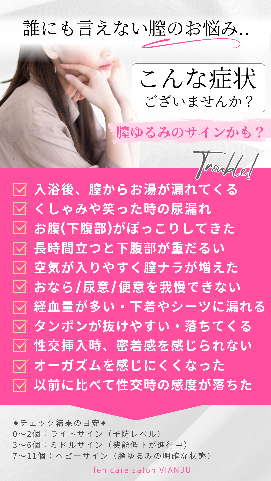 当サロンの施術は、産後ゆるみのお悩みにダントツで多くご相談頂く尿漏れ・お湯漏れを改善。加齢が進むことでエストロゲン分泌が低下し起きてしまった膣萎縮(GSM)〜性交痛の改善も促します。