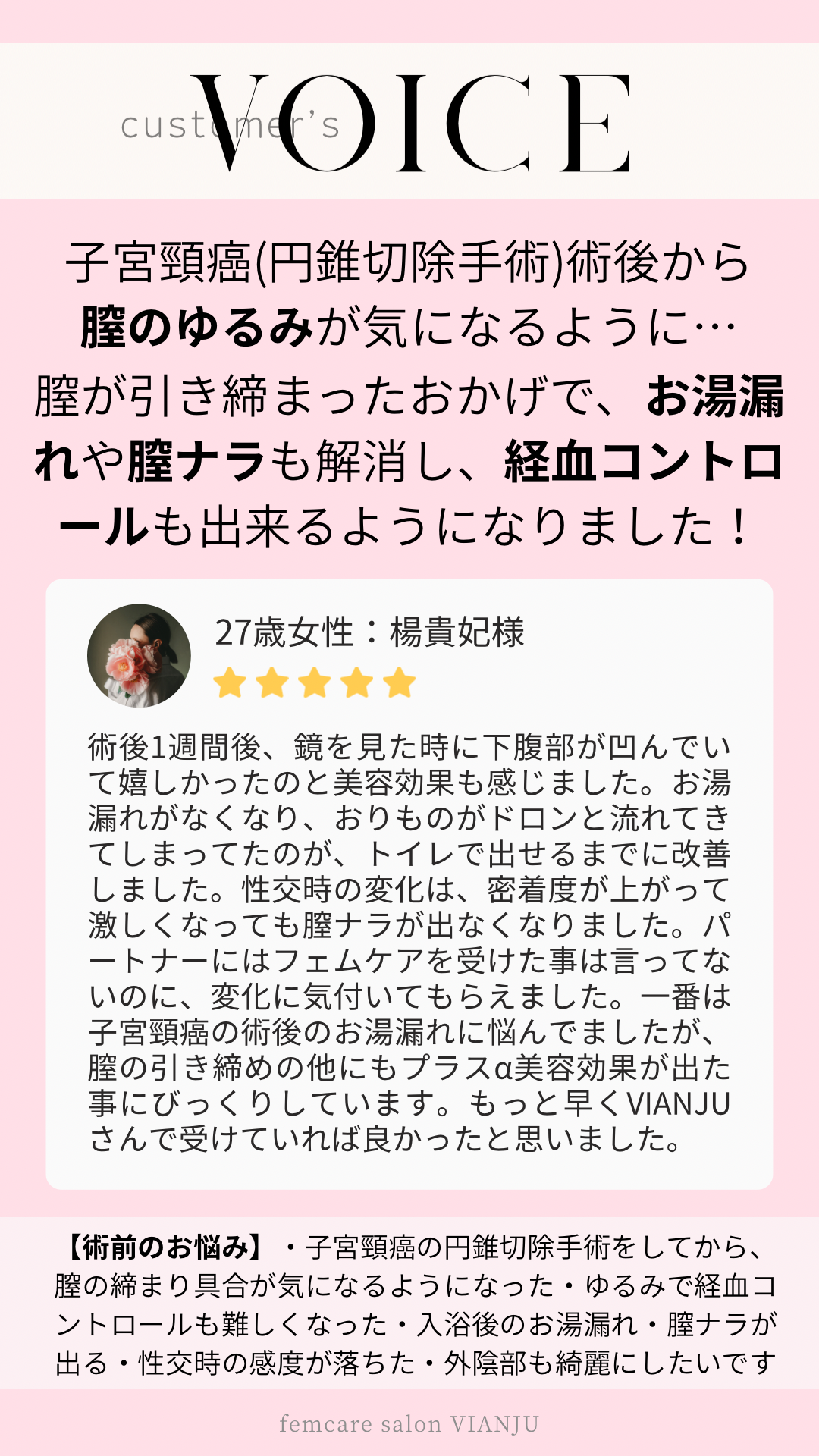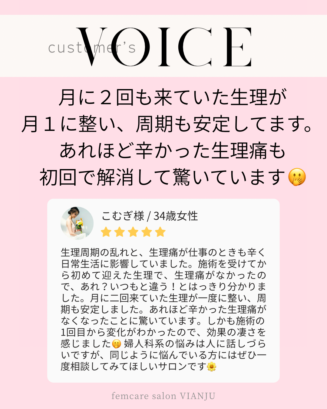 サロン以外では産婦人科クリニックにて、妊産婦様向けの分娩サポートや産後ケアも行なっております。ご質問やご要望等ありましたらお気軽にお問い合わせ下さい。VIANJUは、女性のデリケートなお悩みに本音で寄り添える存在でありたいと願っています。